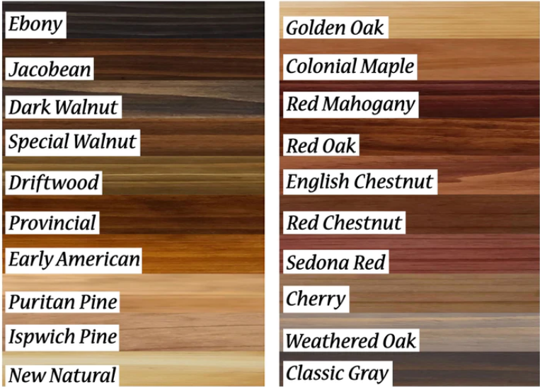 Note: Colors will vary depending upon type of wood. Wood species with strong grain lines will show deeper color absorption than ones without. Typically Pine absorbs stains the least.